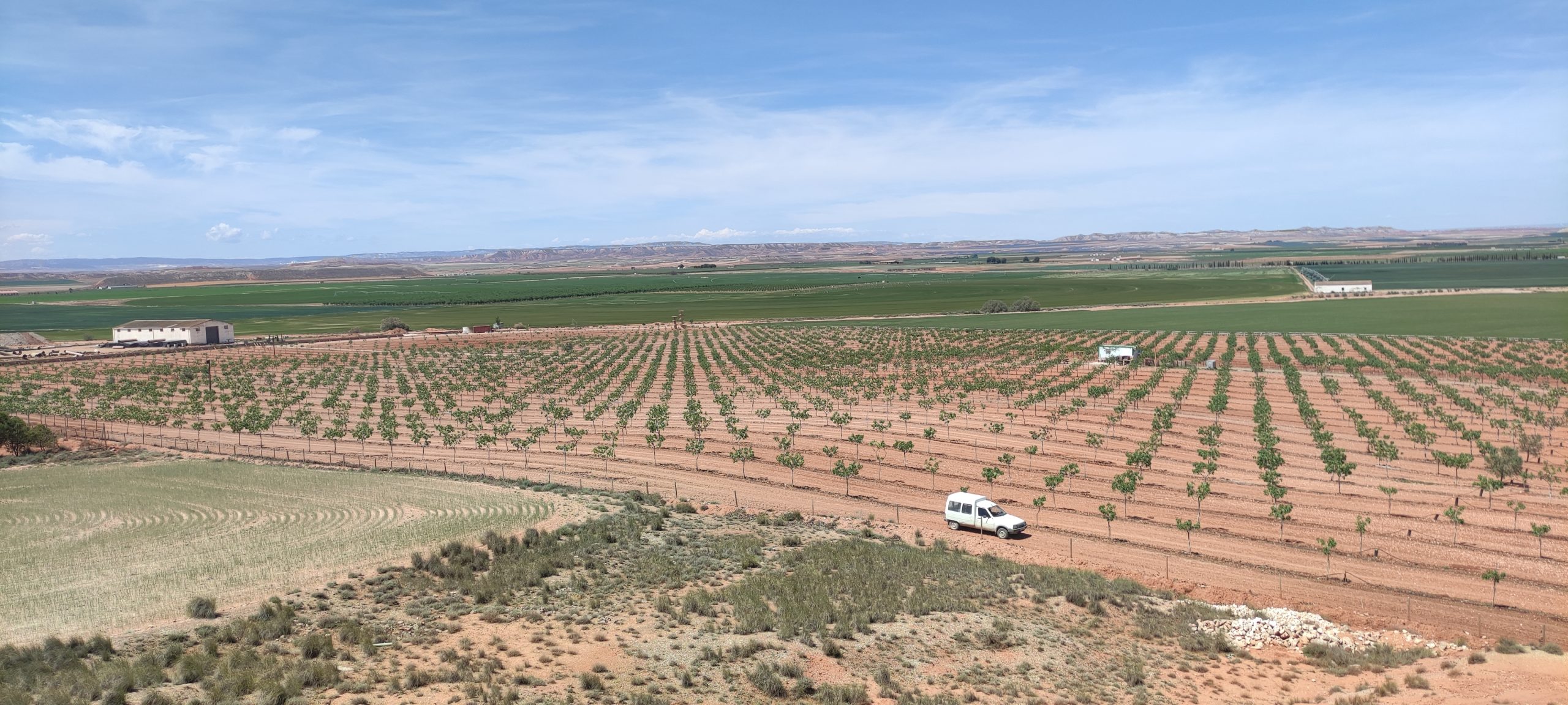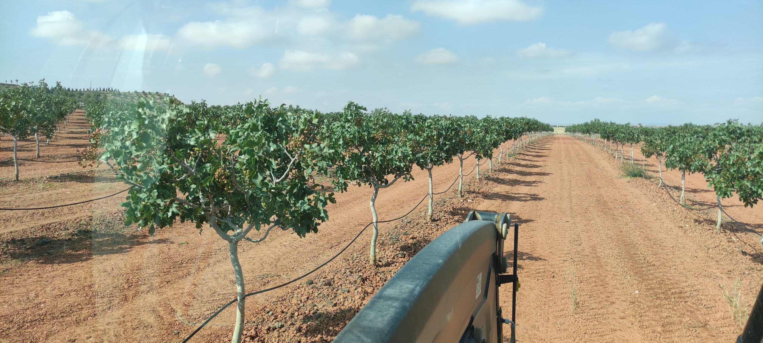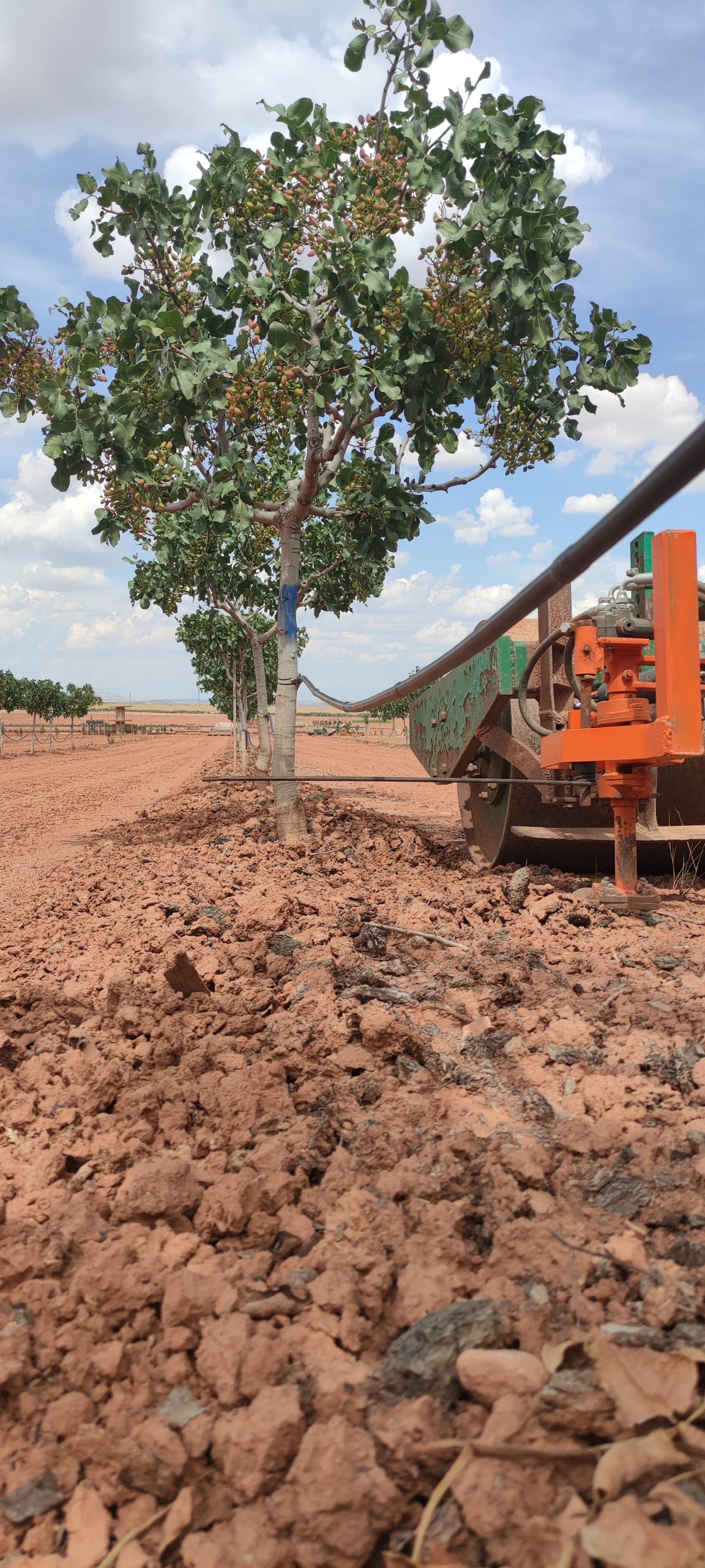 Año 2016 , comienza en Quinto este proyecto , en pleno valle del Ebro y prácticamente en el centro de Aragón, siendo una de las primeras explotaciones de un tamaño considerado que se instaura en la zona de un cultivo desconocido, ya que Aragón y concretamente Zaragoza es tierra de cereal, de vid y olivo en su mayor parte. Año 2014 y 2015 nos desplazamos en repetidas ocasiones a Ciudad Real para aprender y ver explotaciones , allí se encuentran las mas veteranas del país y por lo tanto donde mas experiencia y aprendizaje podemos tener. Realicemos estudios climáticos de 30 años atrás para ver patrones y tener claro si es viable el cultivo en esta zona y por fin dar el paso. A día de hoy principios de 2025 y camino de 9 años después, no a sido todo como se esperaba ni mucho menos, pero la confianza de los clientes que ya nos conocen, nos empujan para seguir cultivando buenísimos pistachos y seguir creciendo poco a poco.