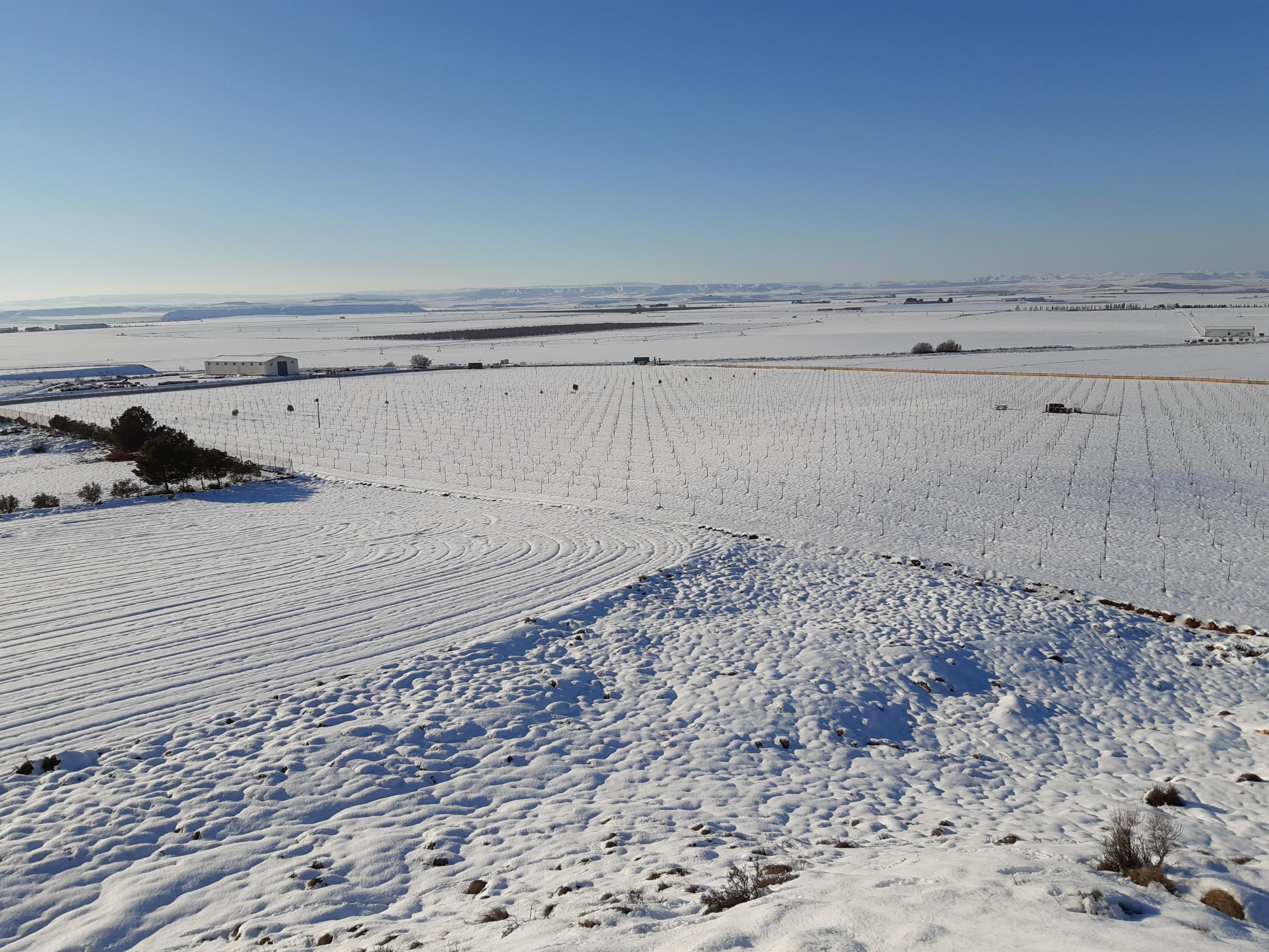 Nuestra finca esta situada en Quinto a 40 km de la capital Aragonesa y a unos 200 m de altitud en pleno valle del Ebro ,unos 5 km en linea recta del rio mas caudaloso de España , el rio Ebro , el cual nos aporta ese agua tan necesaria para regar nuestros arboles, un agua bastante dura, con un ph de 8 que junto a nuestros suelos franco arcillosos y franco limosos donde abunda la arcilla como describo anteriormente, nos dan unas características únicas, pese a tener un gran rio cerca somos un terreno muy árido y seco con las lluvias mas escasas de España, un clima muy extremo de inviernos de hasta -7º grados y veranos de 44 º, acompañado en ocasiones de vientos a veces de hasta 100km/h, tienen consecuencia en el desarrollo de tales y es reflejada en sus frutos, obteniendo buenas calidades.